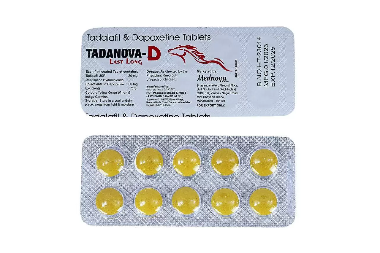 Les substances actives dans Tadanova-D sont le tadalafil et la dapoxétine. Le tadalafil est un inhibiteur de la phosphodiestérase de type 5 (PDE5) utilisé pour traiter la dysfonction érectile, tandis que la dapoxétine est un inhibiteur sélectif de la recapture de la sérotonine (ISRS) utilisé pour traiter l'éjaculation précoce. Ensemble, ces deux substances aident à améliorer la fonction sexuelle et à augmenter la satisfaction sexuelle chez les hommes.Posologie Recommandée de Tadanova-D