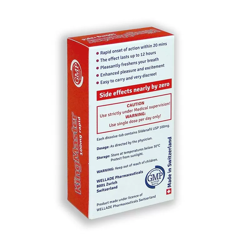 KingMaster 100mg Rapid, comparé à d'autres produits pour l'impuissance de marques connues, a une vitesse d'action plus élevée et comparable uniquement aux gels, est très sûr pour la santé en présentant des effets secondaires réduits grâce à de faibles concentrations de principe actif et a un bon goût qui rend le contact avec les autres agréable.